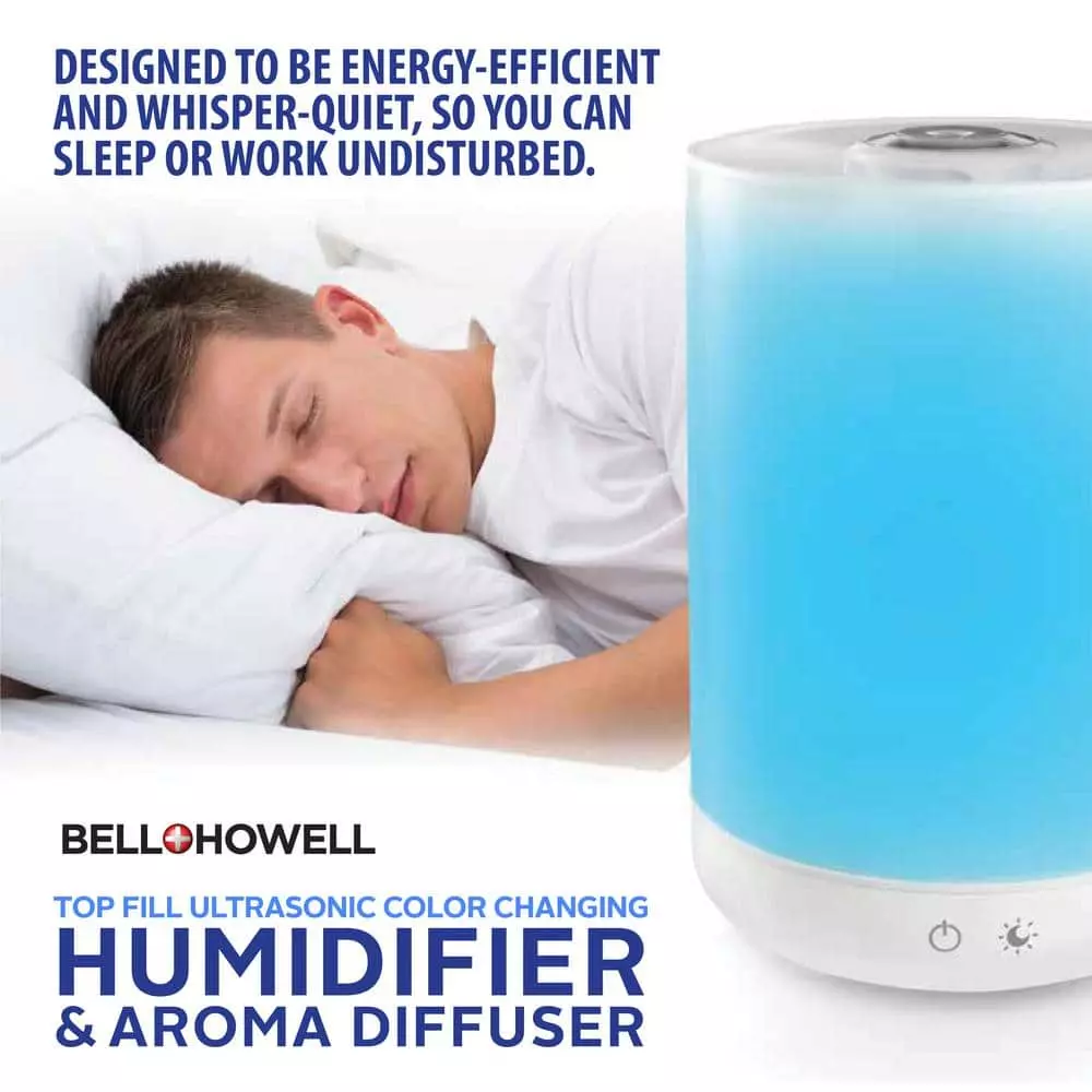 Bell + Howell Ultrasonic Top Fill Humidifier is the perfect humidifier and diffuser to keep your family healthy and happy. with its large 1 Gal. accessible and removable tank, cleaning is so simple. Not to mention, its mist output runs for over 24-hours in a large size room and it works as a diffuser for essential oils and vapor liquids. It’s optional color-changing nightlight is also a great additional feature that gives off a soothing glow. Bell + Howell’s top fill ultrasonic cool mist humidifier and aromatherapy diffuser provides up to 300 sq. ft. of coverage and 24-hours of soothing moisture to help relieve the effects of dryness and congestion. It is helping you and your family to breathe easily and sleep through the night peacefully.