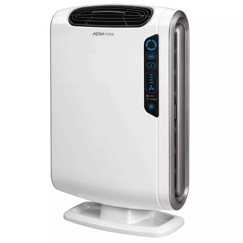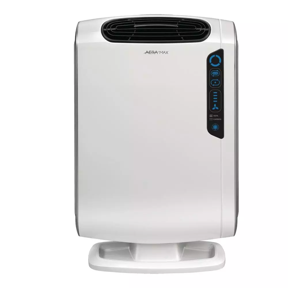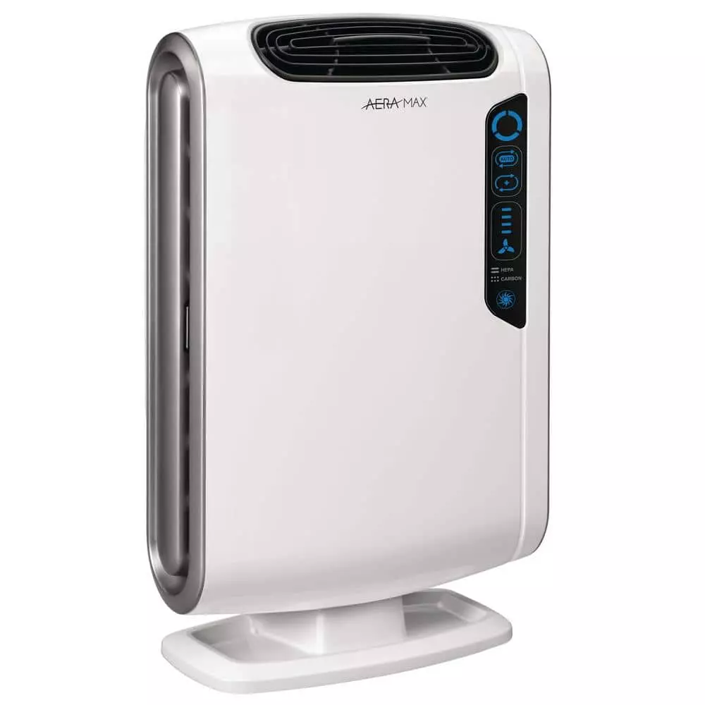 Effectively purifies air in medium rooms 200 sq. ft. to 400 sq. ft. with a 4-stage hospital-type filtration. AeraSmart Sensor monitors the air quality and automatically adjusts the fan speed to keep your air purified. True HEPA filter with AeraSafe antimicrobial treatment safely removes 99.97% of airborne particles as small as 0.3 microns, including pollen, ragweed and other allergens, viruses, germs, dust mites, mold spores, pet dander and cigarette smoke. Extremely effective at capturing influenza virus from indoor air (based on independent testing). Carbon filter removes odors and captures large airborne particulates. Aera Plus Mode for allergy and cold/flu seasons. Ultra-quiet operation. Fan Speed Indicator lets you manually adjust the fan speed setting – low, medium, high or turbo. Filter Change Indicators let you know when it is time to replace your Carbon or True HEPA filter. Built-in handle for easy portability. User-friendly capacitive touch display panel effectively communicates machine performance. Energy Star Certified, UL Listed, Association of Home Appliance Manufacturers (AHAM) Certified, California Air Resource Board (CARB).