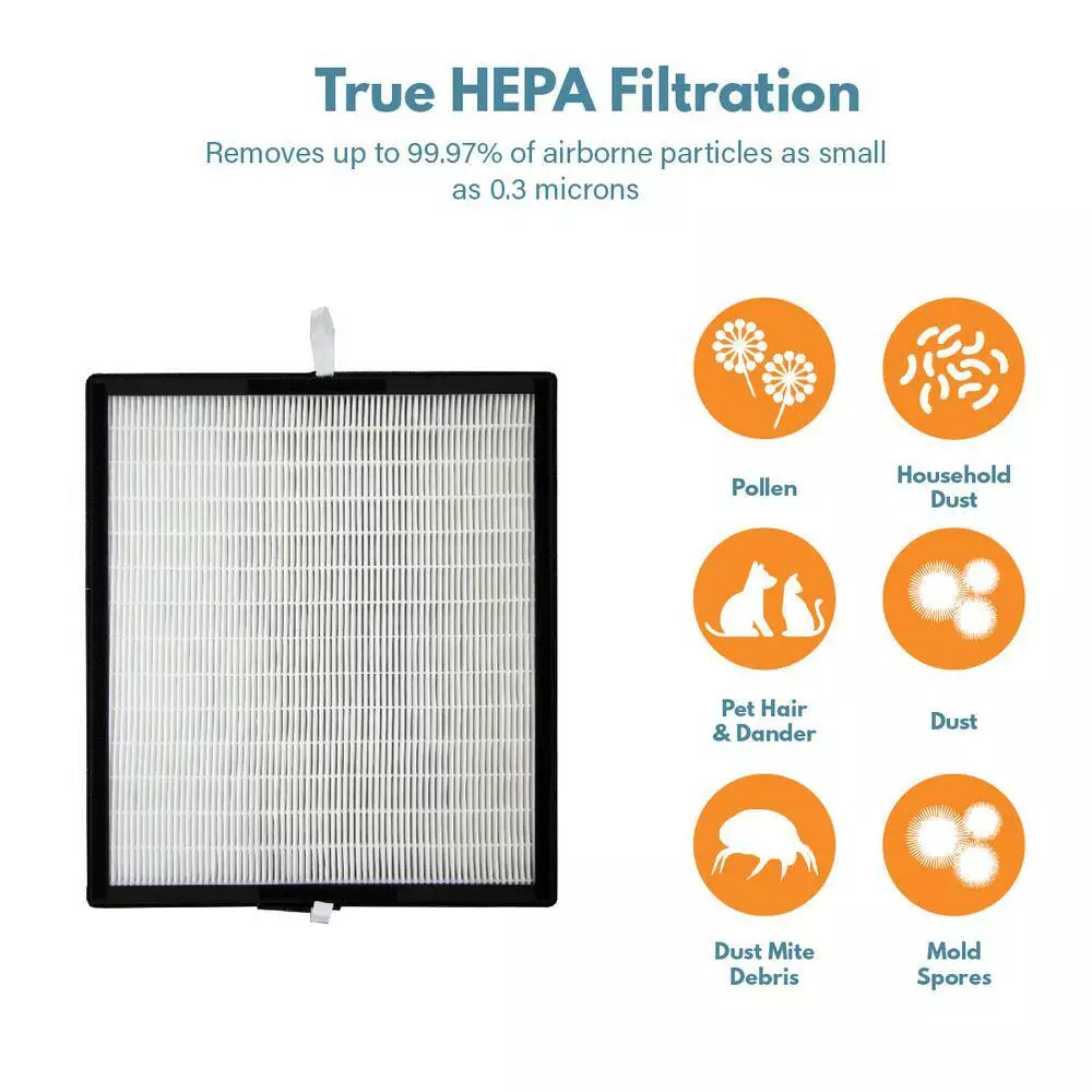 - True HEPA filtration removes up to 99.97% of airborne particles as small as 0.3-microns in size including smoke, dust, pollen, pet dander, mold spores and dust mites