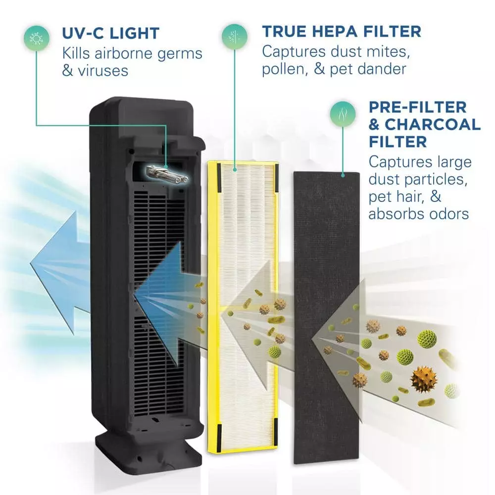 - UV-C light technology works with Titanium Dioxide to kill airborne bacteria, viruses, germs and mold spores