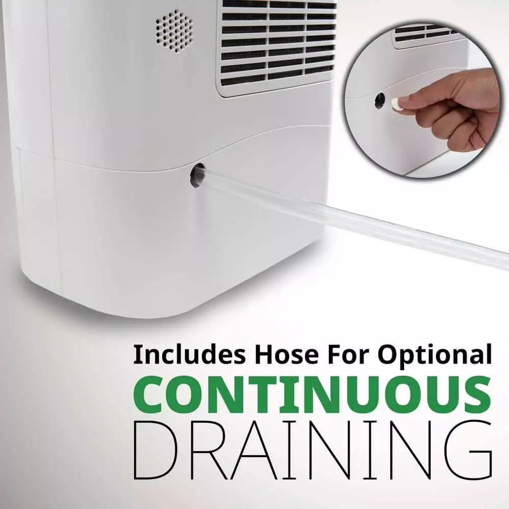 - Continuous drain Hose Hookup – Built in hose connection allows continuous draining in damp rooms