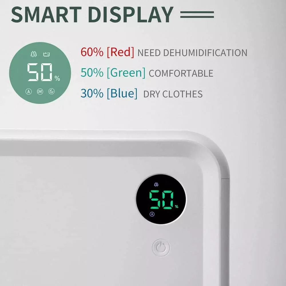 - Intelligent screen displays the real-time humidity levels in different colors: turns red when it reaches above 60%, green when it’s between 40% and 60%, and blue when it’s under 40%