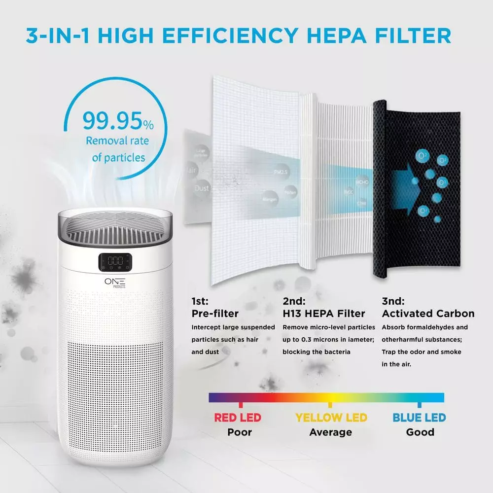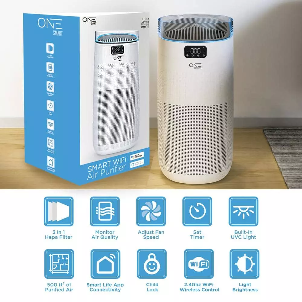 Upgrade the way you live with this Smart Air Purifier with WiFi (OSAP02) by ONE by Promounts. With loads of functionality and stylish modern design, you can ensure that toxins are removed from any home, office, apartment, or workroom.The top-of-the-line 3 in 1 HEPA Air Filter is guaranteed to eliminate 99.97% of odors and particles (such as virus, pollen, allergens, bacteria, pet dander, dust mites, gases, cigarette smoke and many more) leaving you with the reassurance that you can breathe freely.The ATHENA Air Purifier will purify up to 500 square feet and is the perfect addition for any large room. The air quality detector allows you to breathe easy and worry-free. Using colored LED light sensors, you will be quickly notified of 3 different air qualities (good, moderate, poor) and adjust between 4 fan speeds to ensure your space is purified of any lingering toxins. With the built-in Auto Mode, fan speeds will automatically adjust according to the present air quality, freeing you of any hassle or worry.Also included, the built-in UVC Light kills 99.99% of germs to ensure a clean indoor environment. Download the Smart Life App to provide hands-free voice control by syncing with Google Home Assistant and Amazon Alexa for the ultimate experience.Get the most out of the products you love and enjoy. It is our goal to help you get the most out of life, and our products help to take the worry and hassle out of the equation.