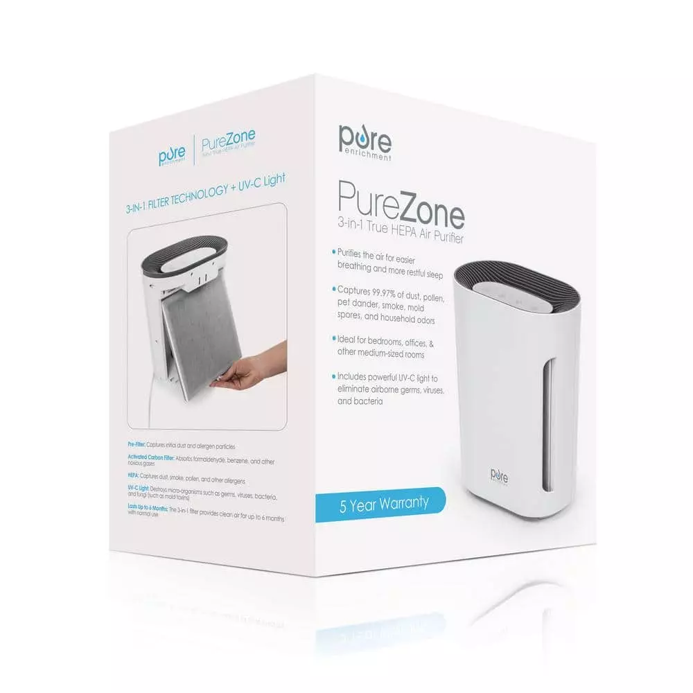 PureZone safely sanitizes the air in your home or office in a few short hours making it more breathable, enjoyable and even healthier. The sleek, modern design complements any decor and is fully customizable with 3 speed settings and an automatic timer to conserve energy and extend the life of the 3-in-1 air filter. Thanks to True HEPA filtration which is proven to eliminate 99.97% of particles as small as 0.3 microns PureZone provides a perfect solution for making the air more comfortable for people who suffer from allergies, asthma or other breathing issues.