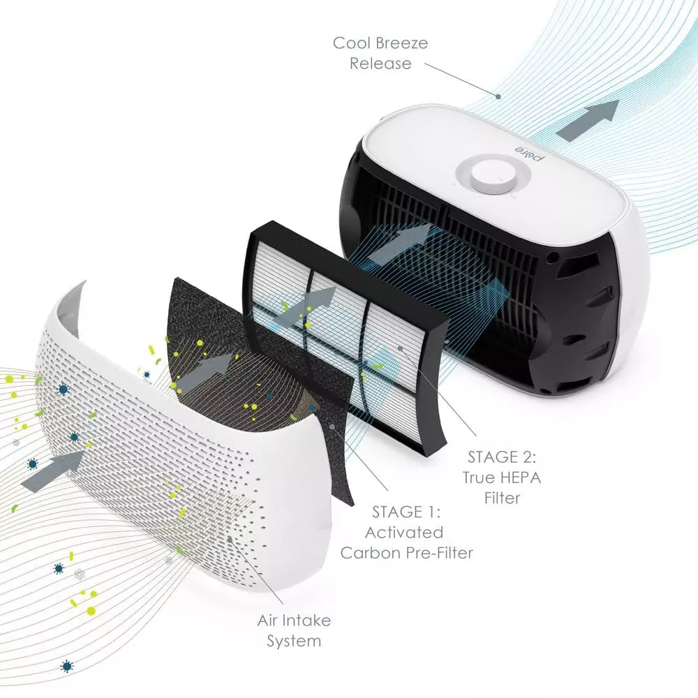 Make way for a fresh breeze of clean air in every room with the PureZone Breeze Tabletop Air Purifier from Pure Enrichment. Enjoy improved air quality as the premium 2-stage filter safely cleans the air in bedrooms, offices, and nurseries. This modern tabletop air purifier fits perfectly on any desk, nightstand, or end table while its True HEPA filter removes 99.97% of particles as small as 0.3 microns. Simply plug it in and adjust the control knob to your choice of low, medium, or high speed to start enjoying fresher air at home.