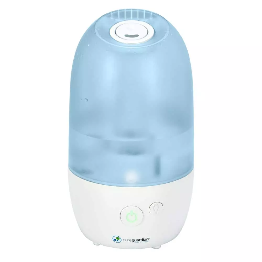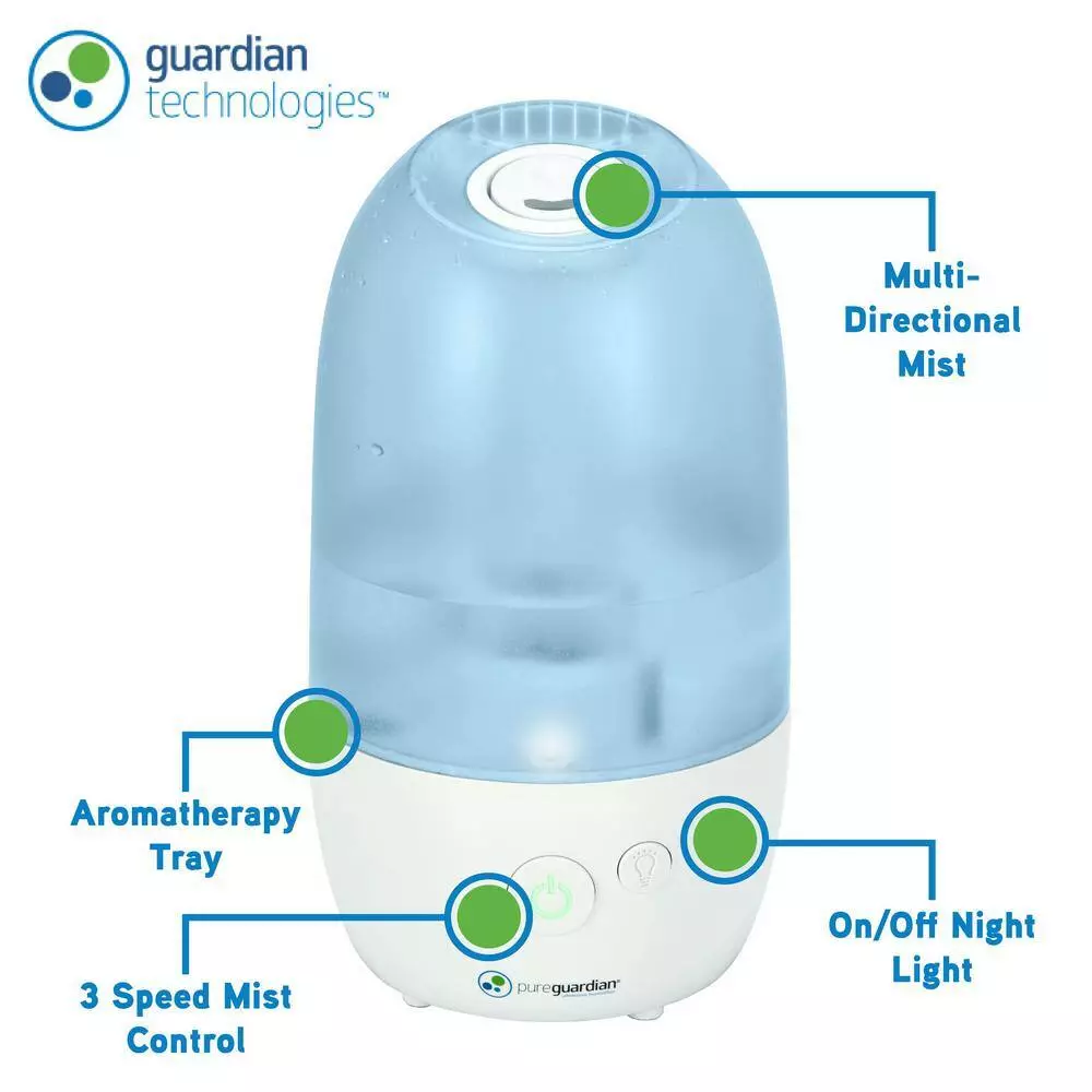 The 70-hour Ultrasonic Cool Mist Humidifier guards against problems caused by dry air in the home. It features an easy to fill 1 Gal. tank, ideal for use in small to medium rooms. Unlike other humidifiers that grow slimy mold on the water tank surface, Silver Clean Protection is embedded in the tank to fight the growth of mold and mildew on the surface of the water tank. Thanks to ultra-sonic technology, it disperses a fine mist into the air, and is ultra-quiet making it ideal to have on while you sleep. It has an optional aromatherapy tray so a few drops of essential oil can be added to create a relaxing atmosphere. A low water indicator light lets you know when it’s time to refill the water tank. It also features a soft glow night light. PureGuardian humidifiers create a better home environment for those suffering from colds, allergies and dry skin. Note: Run time is based off of running the unit on low setting and cool mist, also depends on atmospheric conditions.