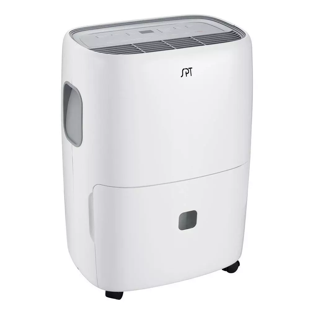 This new 50-pints dehumidifier features carefree operation with built-in pump, allowing unit to continuously discharge moisture. The unit can pump water upward to drain out a window or into a sink – up to 16 ft. (hose provided). There is still the option to drain passively or empty the water tank manually. Designed to remove excess moisture from your home quietly and efficiently. A necessity for those suffering from dust mite, allergies or simply for those who wants to keep their indoor humidity at a comfortable level. Air that is too damp can cause itchy skin and nasal passages, condensation on windows, water damage to materials, mold growth and rotting of wood materials in your home. SPT dehumidifiers remove moisture from the musty air so you can enjoy year-round comfort in your home or office. Humidity level for this unit can be set as low as 35% with Low or High fan speed. Features washable air filter with reminder indicator and casters for easy mobility.