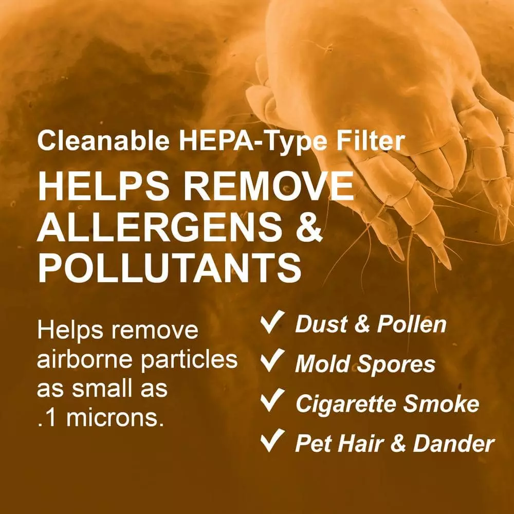 - Cleanable HEPA-type filter removes airborn particles as small as 0.1 Micron