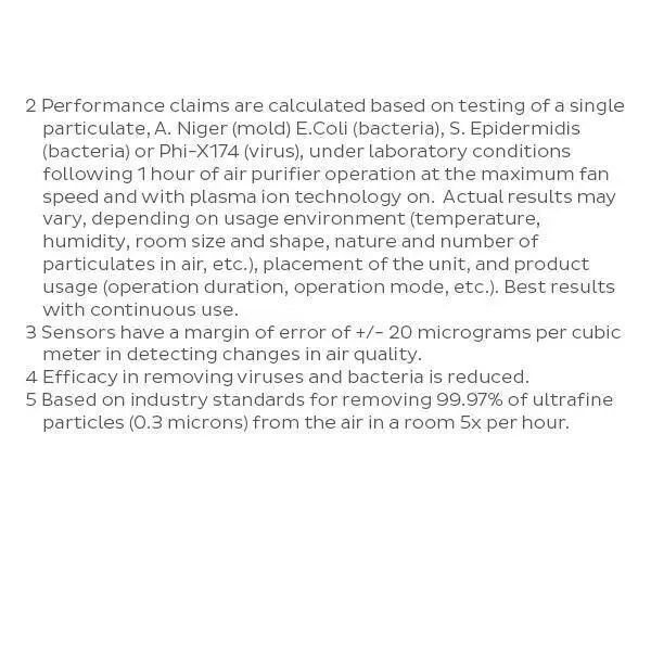 - Performance claims are calculated based on testing of a single particulate, A Niger (mold) E. Coli (bacteria), S.epidermidis (bacteria) or Phi-X174 (virus), under laboratory conditions following 1-hour of air purifier operation at the maximum fan speed and with plasma ion technology