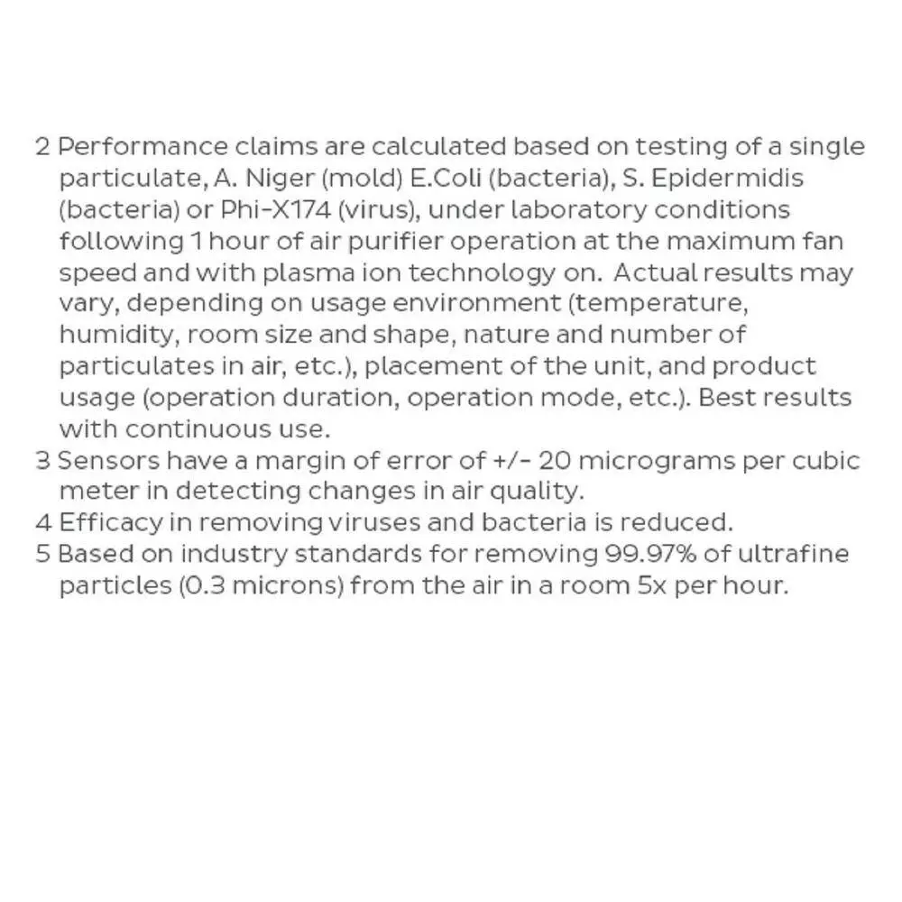 - Performance claims are calculated based on testing of a single particulate, A Niger (mold) E. Coli (bacteria), S.epidermidis (bacteria) or Phi-X174 (virus), under laboratory conditions following 1-hour of air purifier operation at the maximum fan speed and with plasma ion technology
